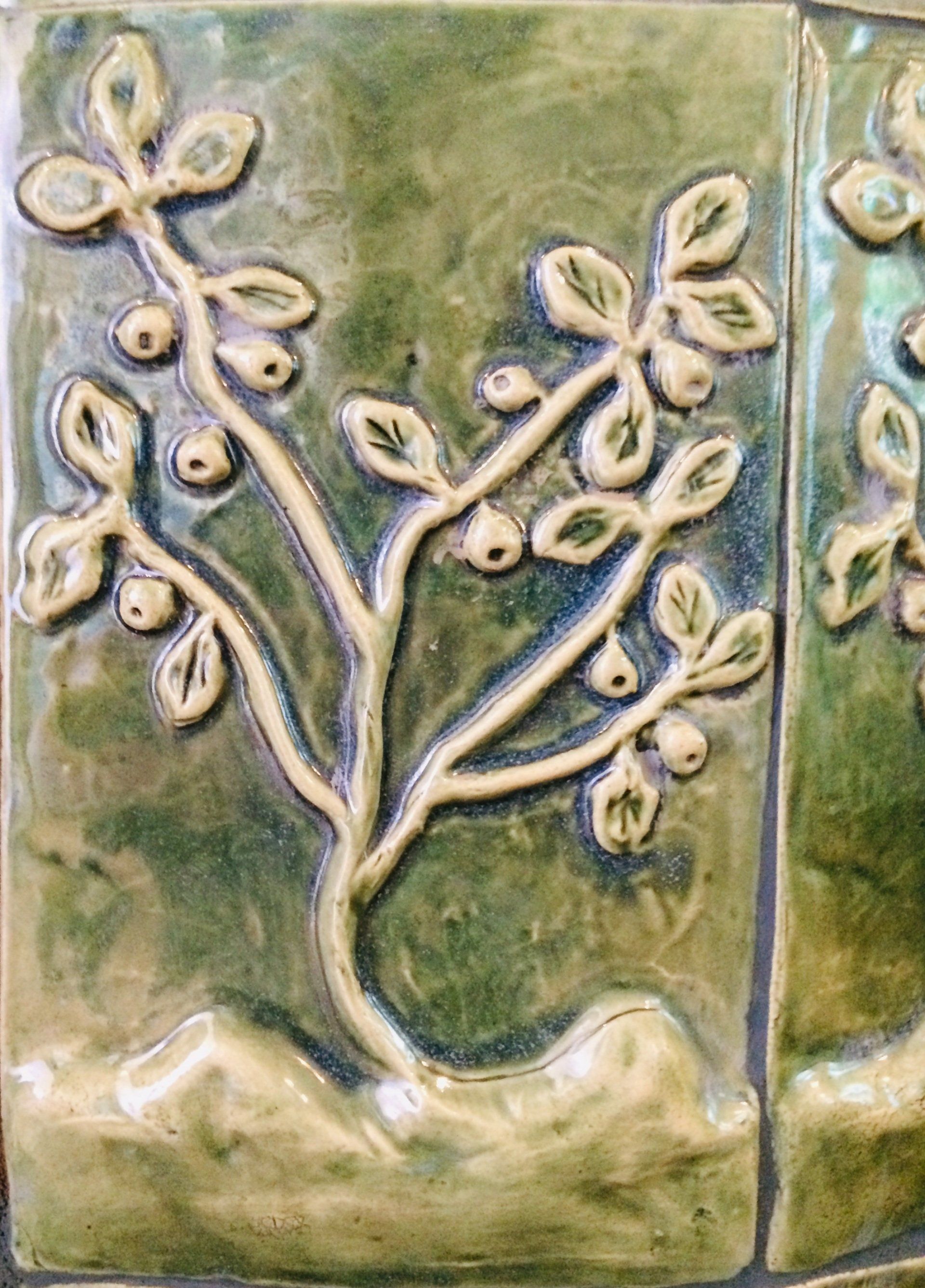 Kakluuniverstaan Mustikkapaikka-uuni. Kaareva nurkkauuni jossa alhaalla asiakkaan toivomia mustikanvarpuja ja ylhäällä männynoksia.
