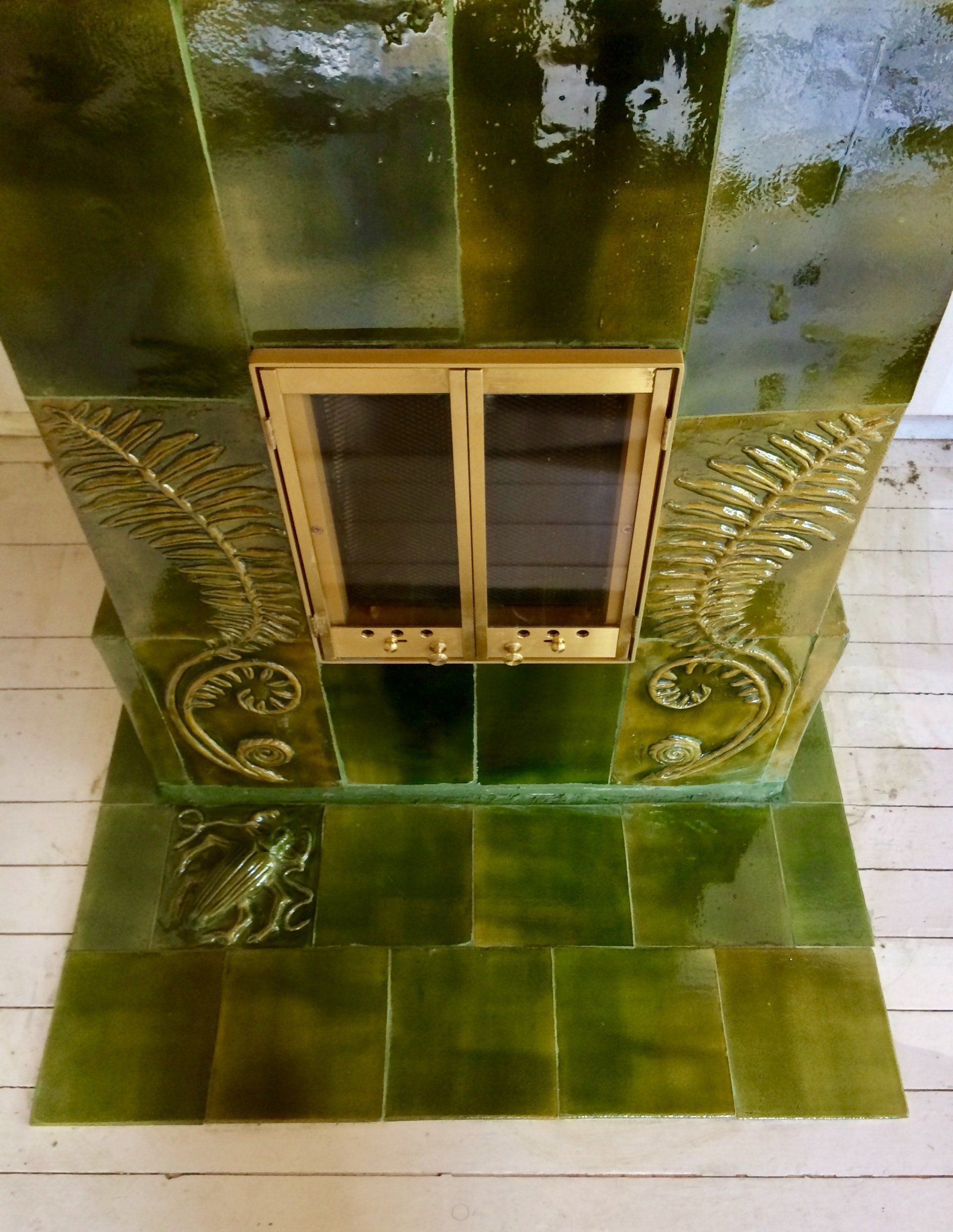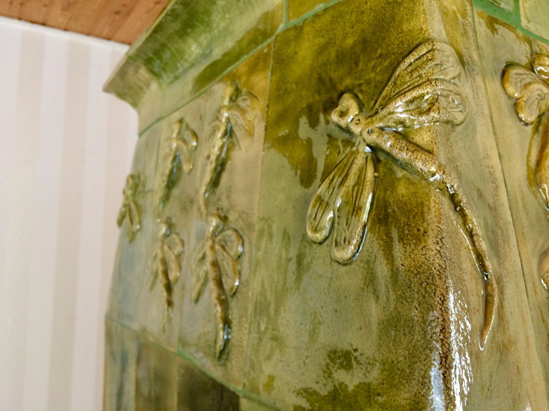 Uunissa on saniaisreliefit tulipesän luukun molemmin puolin ja sudenkorentoja yläosassa.
