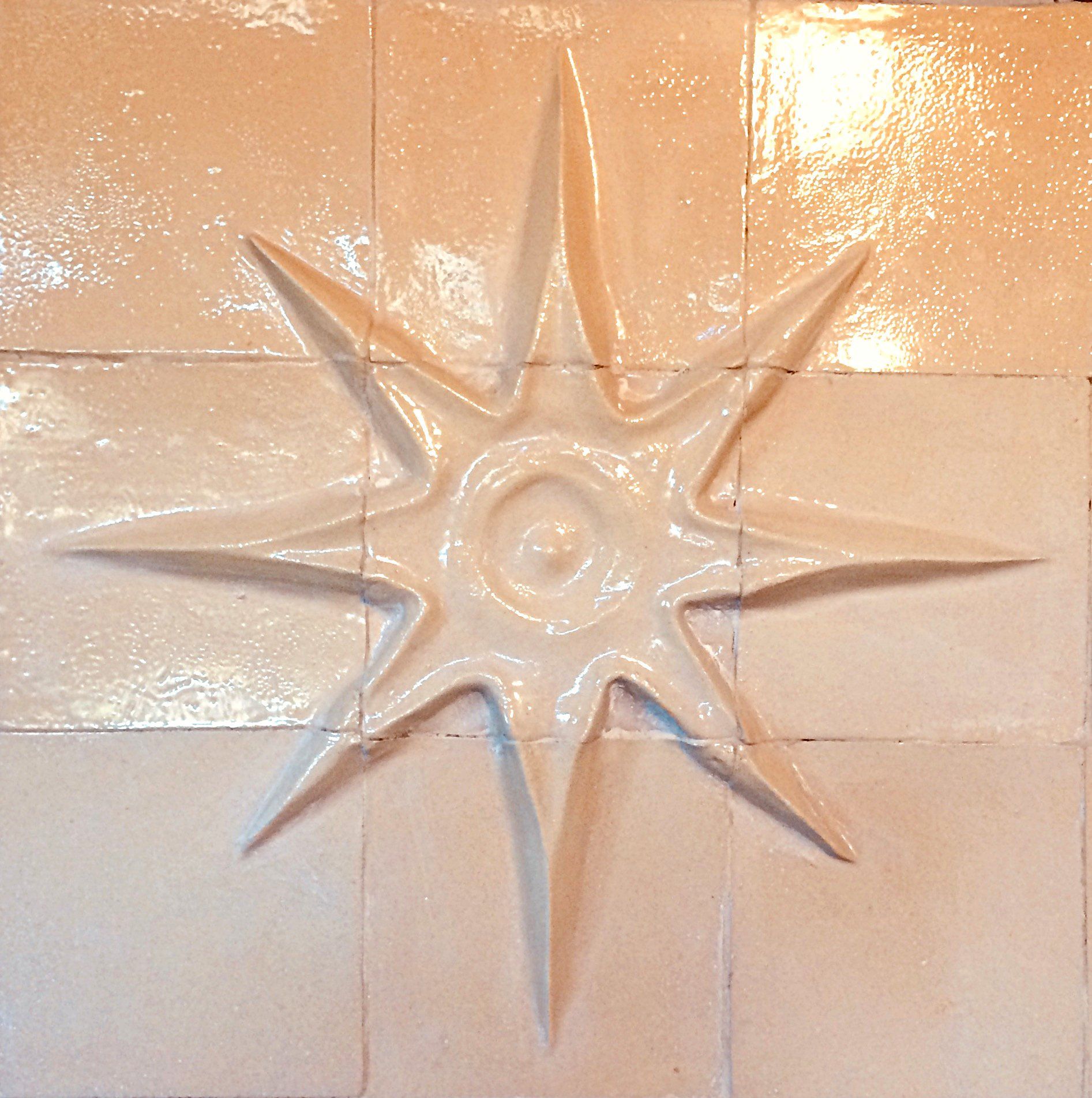 Kakluuniverstaan Pohjantähti-uuni. Matala kaakeliuuni jossa aallokko alhaalla ja yhdeksästä kaakelista muodostuva kompassiruusu yjhäällä.